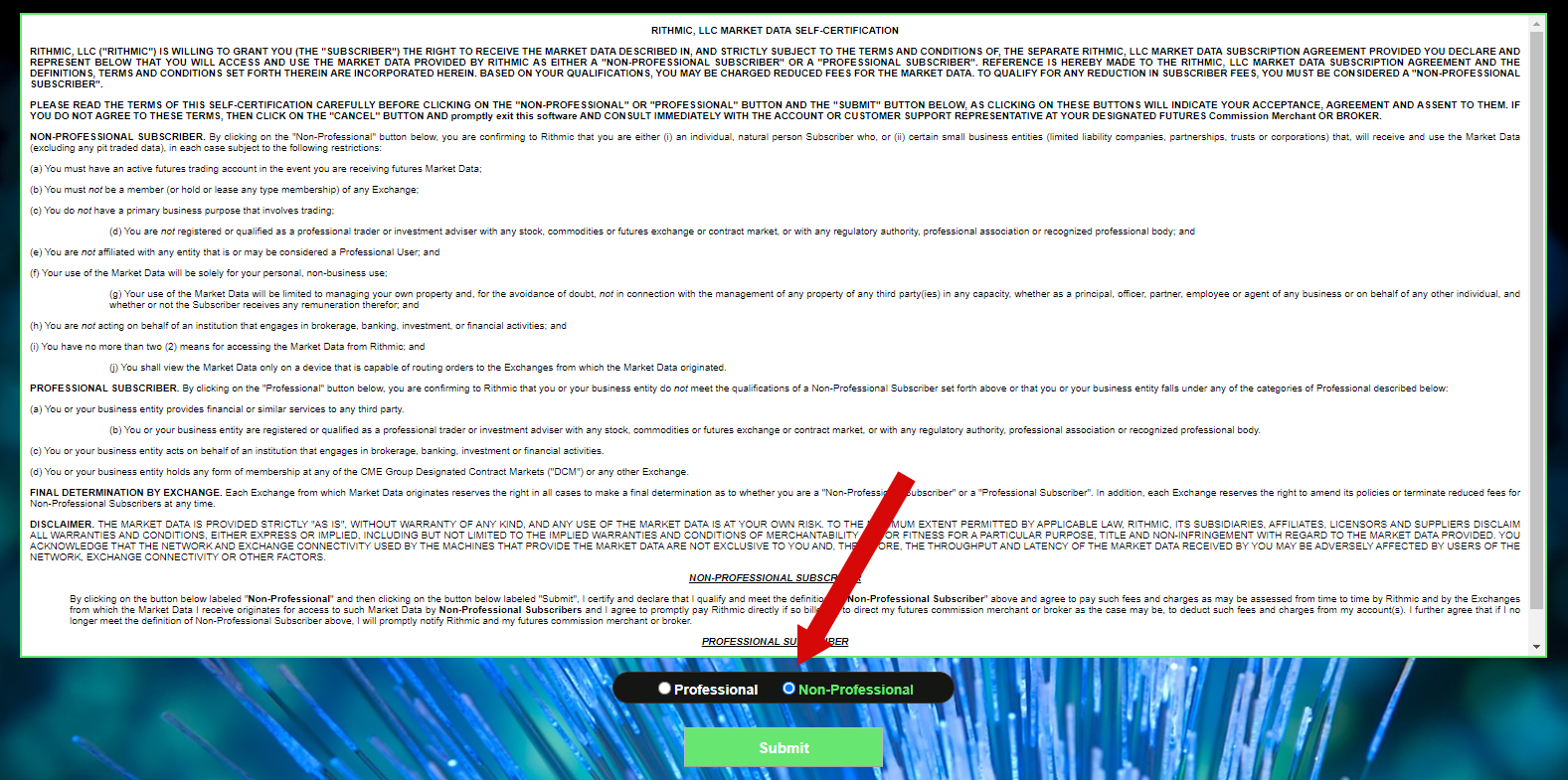 Achten Sie darauf, dass Sie in dieser Vereinbarung die Option „Non-Professional“ auswählen, um zu vermeiden, dass für die Nutzung von Rithmic Gebühren anfallen.