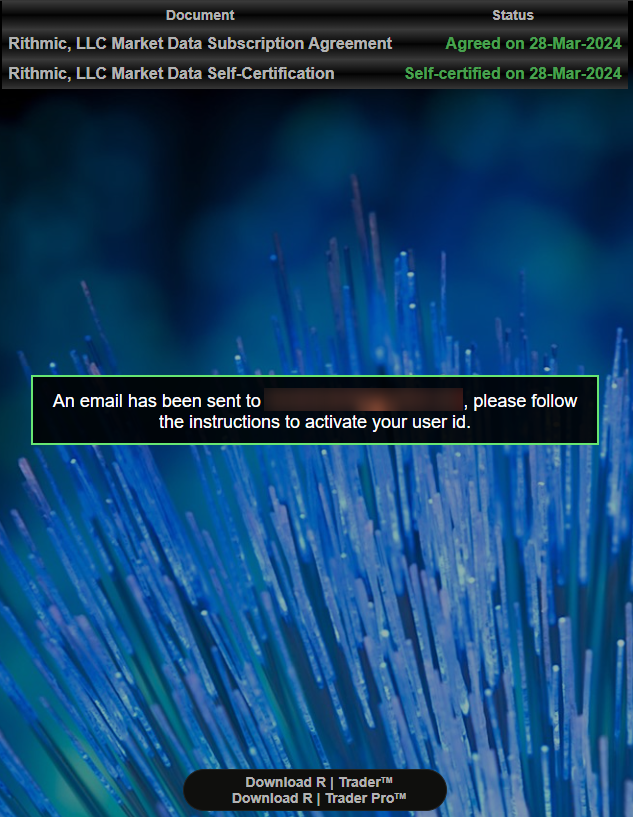 Als nächstes sehen Sie eine Bestätigung der beiden unterzeichneten Vereinbarungen (oben) und eine an Ihre E-Mail-Adresse gesendete E-Mail zur Aktivierung Ihrer Rithmic-Benutzer-ID (in der Mitte der Seite).
