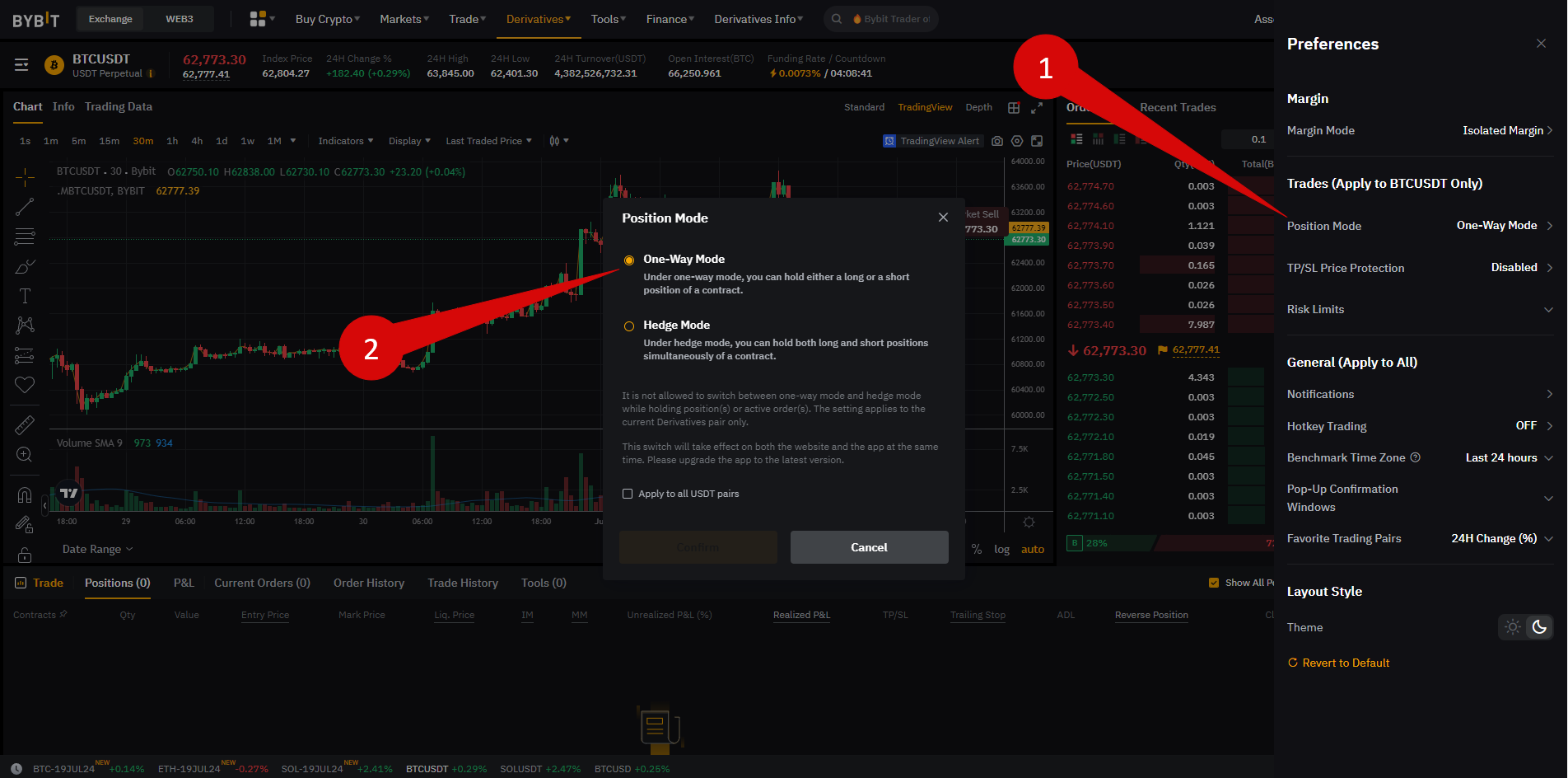 Um über ATAS zu handeln, müssen Sie den Einweg-Positionsmodus aktivieren. Der Hedging-Modus ist in ATAS nicht verfügbar. Sie können den Modus in den Charteinstellungen auf der Börse ändern.