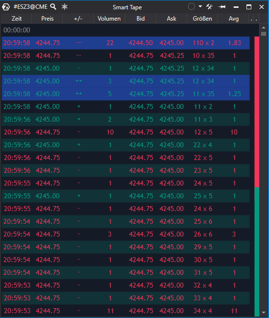 Beispiel: Wenn der Preis von 100 → 101 → 101 → 102 steigt, zeigt das Tape: +, +, ++. Wenn der nächste Trade bei 101 liegt, wird - angezeigt.