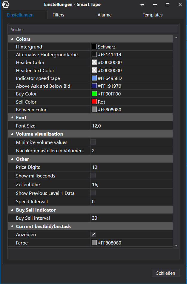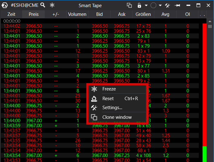 In der klassischen Version zeigt dieses Tool einen Strom von Orders, die in Teile aufgeteilt sind (zum Beispiel kann eine Marktorder über 100 Lots als 100 einzelne Prints angezeigt werden). Das macht das Lesen des Tapes aufgrund der Menge und Geschwindigkeit der Prints schwierig, weshalb nur wenige Menschen das Tape effektiv interpretieren können.