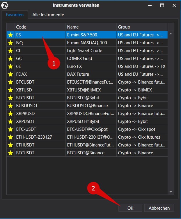 Es öffnet sich das Fenster Instrumentenmanager. Wählen Sie ein Instrument aus der Registerkarte Alle Instrumente oder aus Favoriten.