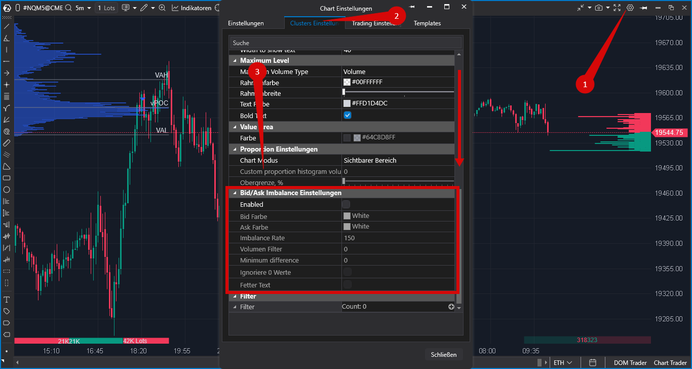 Der Imbalance Rate wird als Prozentsatz der verglichenen Mengen definiert. Der Standardwert ist 150 %, aber wenn Sie den Wert z. B. auf 300 % setzen, wird ein größeres Ungleichgewicht hervorgehoben. Um den Parameter zu ändern, gehen Sie im Cluster-Chart auf die Registerkarte Cluster-Settings/Cluster-Einstellungen im Einstellungsmenü und stellen Sie den gewünschten Wert unter Imbalance Rate ein, wie in der Abbildung gezeigt.