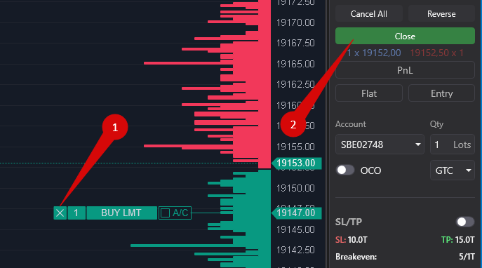the CLOSE button/Close the current position and remove all pending orders on the Chart Trader panel to the right.