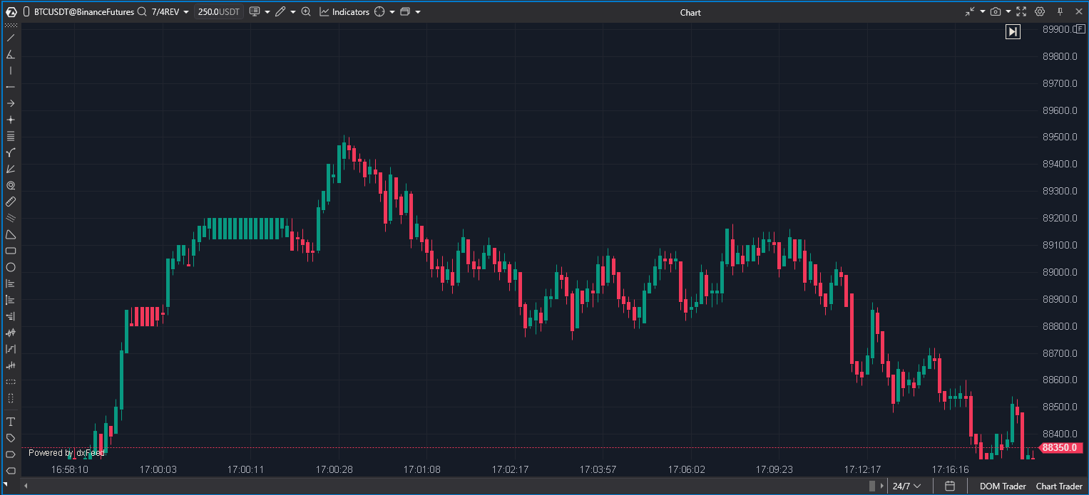 This results in a chart where trades are evenly distributed across bars. This type of chart is particularly useful with volume indicators to evaluate volume structure, detect large player activity, and analyze price reactions.