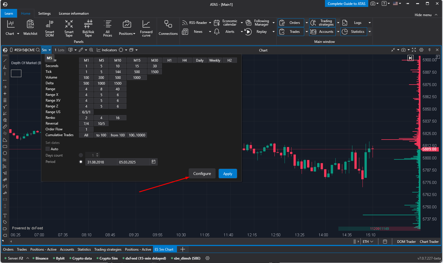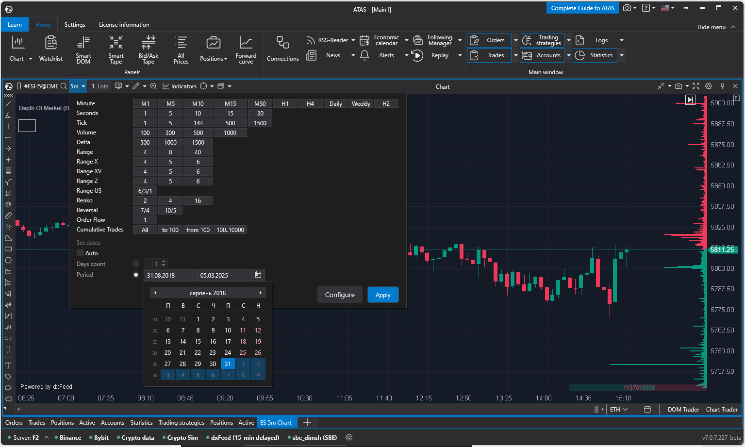 In the ATAS platform, you can adjust chart periods and types. In addition to the standard time intervals available here, you can also specify other interval types with various settings.