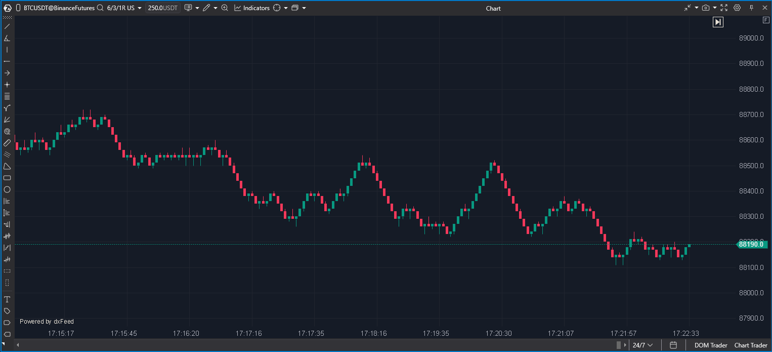 This results in a chart where trades are evenly distributed across bars. This type of chart is particularly useful with volume indicators to evaluate volume structure, detect large player activity, and analyze price reactions.