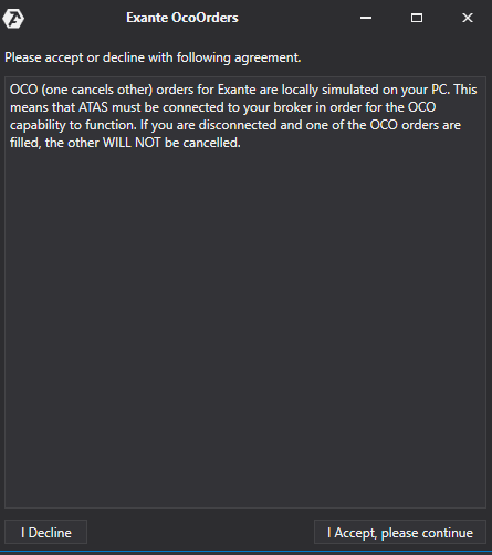 OCO (one cancels other) orders for the Exante connection are locally emulated on your computer. This means that the platform must be connected to your broker for OCO orders to function properly. If you are disconnected and an OCO order is filled, the other orders of the same group WILL NOT BE CANCELED!