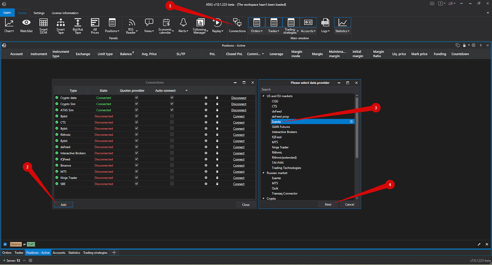 1. To configure the Exante connection to the ATAS platform, enter the menu of the main window of the ATAS platform and left-click on the item Connections.