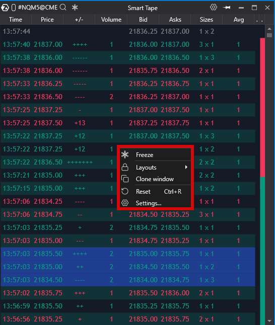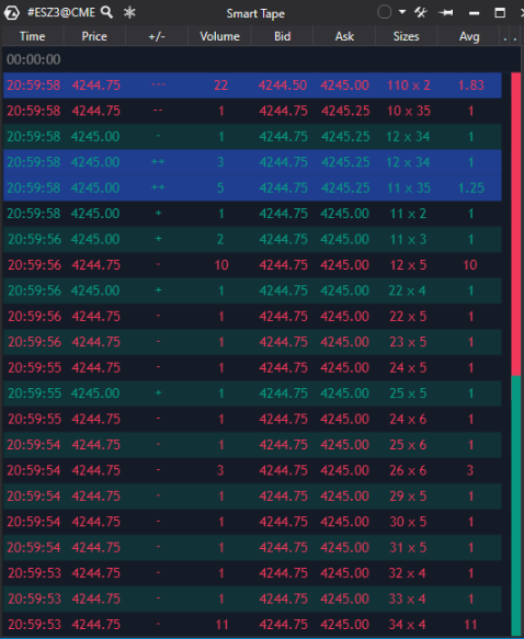 The main advantage of Smart Tape ATAS is the ability to group incoming ticks (individual prints) in a way that allows the trader to see the actual market orders in their entirety.