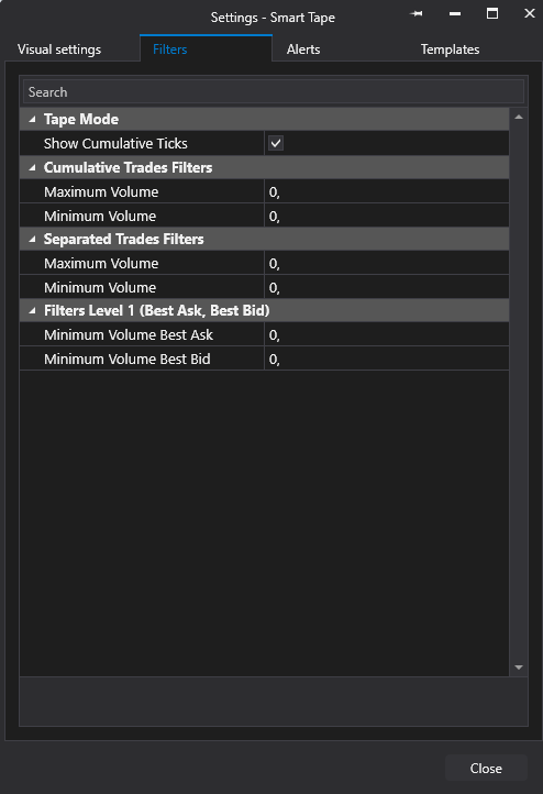 Filter prints with defined minimum Best Bid/Ask volume.