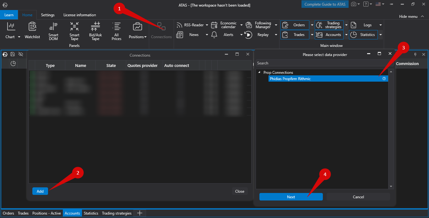 3. To connect the account, click the Connections button in the main platform window, then click Add, and in the next window, select the Phidias Propfirm Rithmic