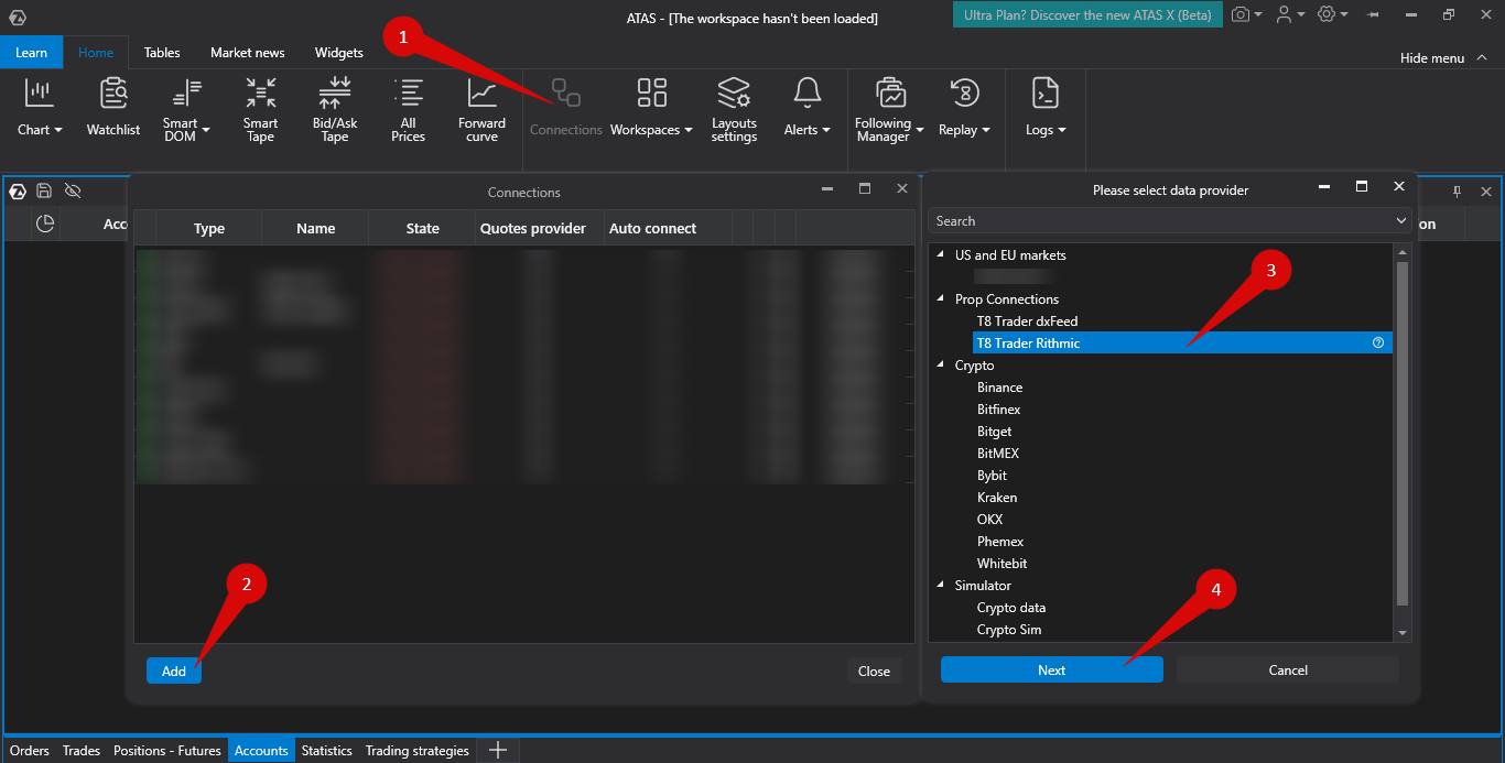 1. To connect the account with Rithmic, click the Connections button in the main platform window, then click Add, and in the next window, select the T8 Trader Rithmic
