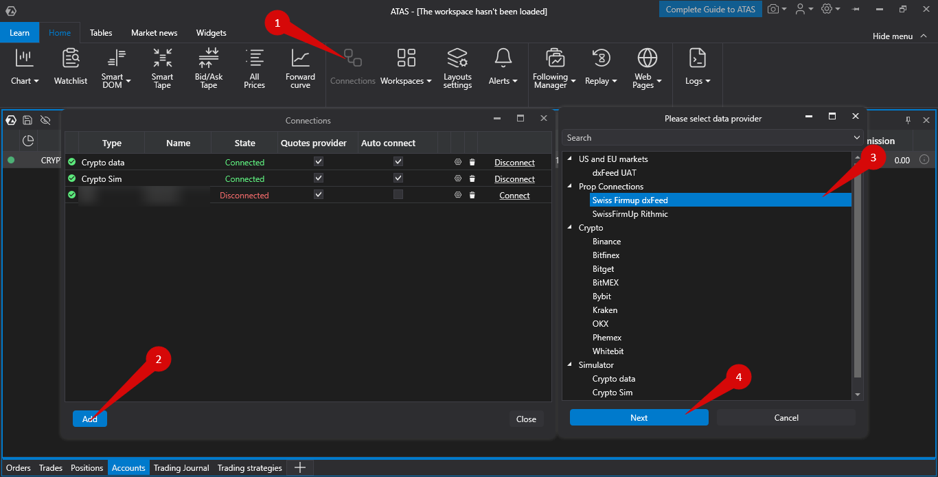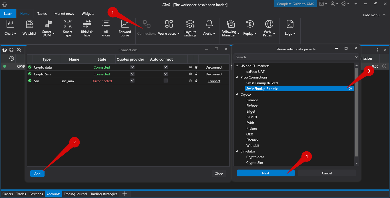 1. To connect the account, click the Connections button in the main platform window, then click Add, and in the next window, select the Swiss FirmUp Rithmic