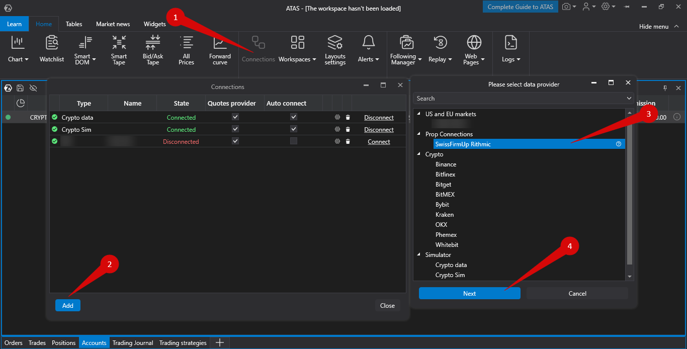 3. To connect the account, click the Connections button in the main platform window, then click Add, and in the next window, select the SwissFirmUp Rithmic