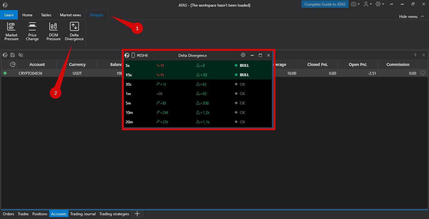 Delta Divergence (Дивергенция Дельты) — виджет для отслеживания расхождений между движением цены и изменением дельты (баланса покупок/продаж) в режиме реального времени.