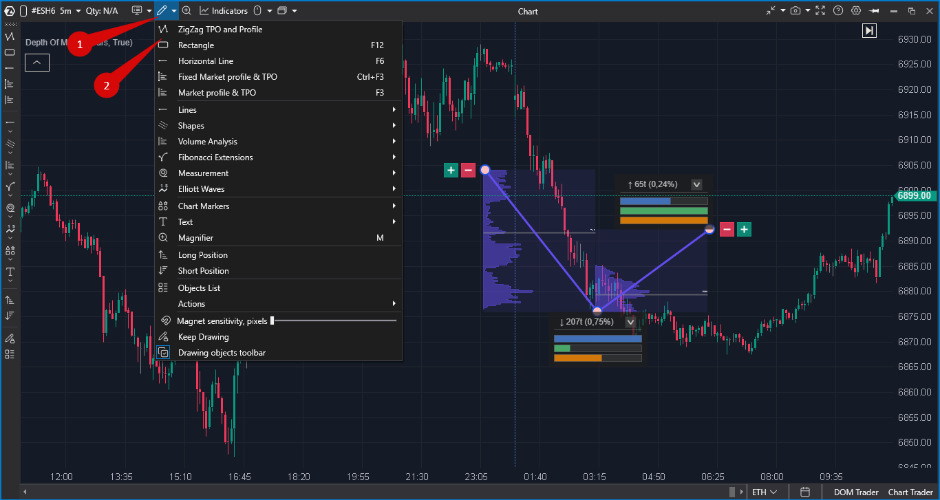 ZigZag TPO and Profile — аналитический инструмент рисования в ATAS, который объединяет возможности классического индикатора ZigZag с профильным анализом рынка. Инструмент позволяет выделить импульсные движения цены на графике и автоматически построить для каждого движения TPO-профили, объемные профили и рассчитать ключевые метрики.