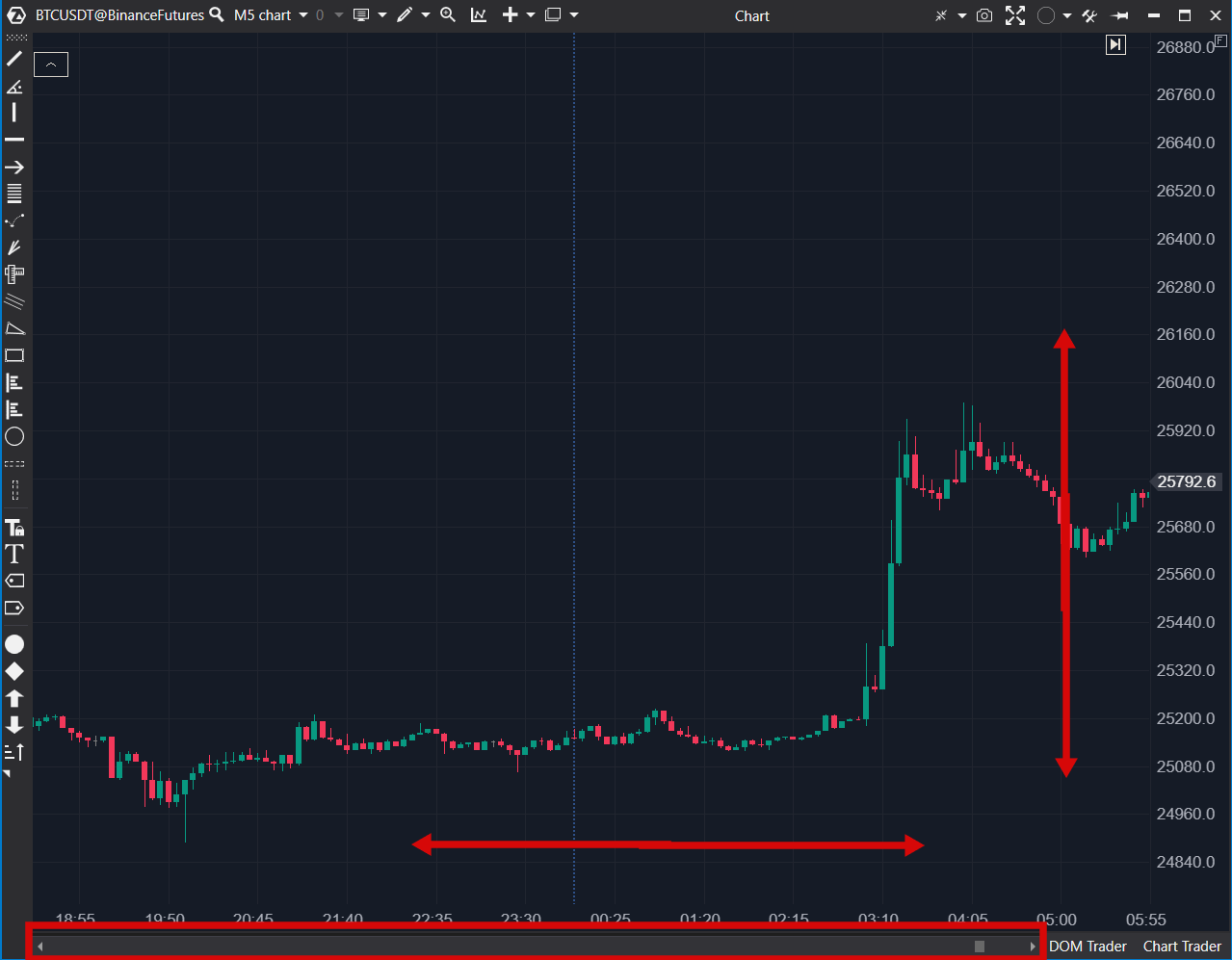 Pour faire défiler le graphique, vous devez faire un clic gauche sur le graphique, maintenir enfoncé et, sans relâcher, déplacer vers la gauche/droite ou vers le haut/bas. Ou utilisez le défilement de la souris. Vous pouvez utiliser les boutons Page Up, Page Down. Vous pouvez également utiliser le curseur en bas du graphique et les flèches dans les coins inférieurs du graphique.