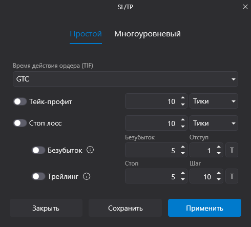 SL/TP - sont des fonctions de protection automatique des positions qui vous permettent de vous concentrer sur le trading au lieu de la passation des ordres. Par exemple : à l'aide de stratégies de protection, vous pouvez prédéfinir où le Stop Loss et le Take Profit seront fixés lors de l'entrée en position. Vous pouvez également définir les règles et les conditions du déplacement automatique du stop vers le seuil de rentabilité et du trailing stop, qui suivra le prix, protégeant ainsi votre profit. Ces règles vous permettront de construire votre propre méthodologie de trading.