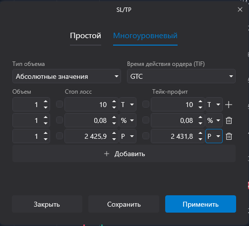 Multiniveau - section conçue pour un paramétrage plus flexible des Stop Loss et Take Profit automatiques pour la position ouverte - permet de placer des ordres de protection à plusieurs niveaux.