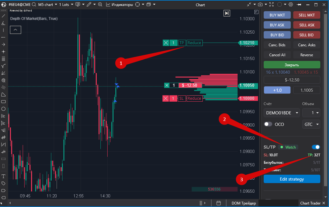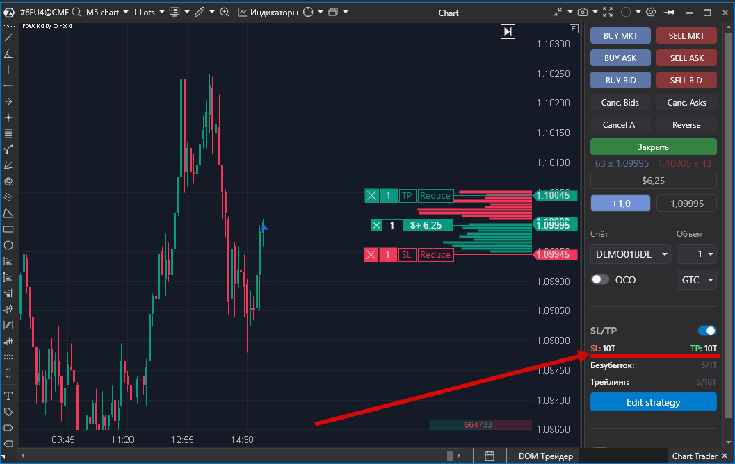 La fonction SL/TP est disponible à la fois sur le panneau Chart trader (lors du trading à partir du graphique) et depuis le carnet d’ordres Smart DOM.