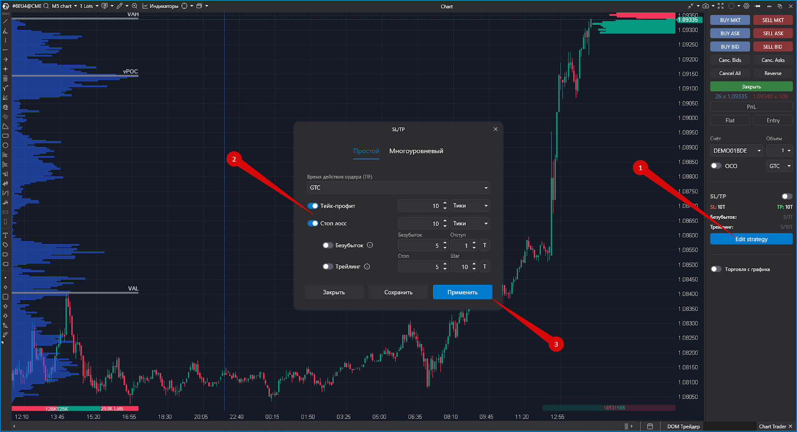 Après avoir déplacé le take manuellement (1), nous pouvons voir que le mode Watch a été activé (2) et que la distance au take dans l'interface de la stratégie a changé pour une nouvelle valeur (3), mais les paramètres de la stratégie restent inchangés. Lorsque la stratégie est désactivée et utilisée à nouveau, les ordres de protection seront placés à une distance de 10 ticks conformément aux paramètres.