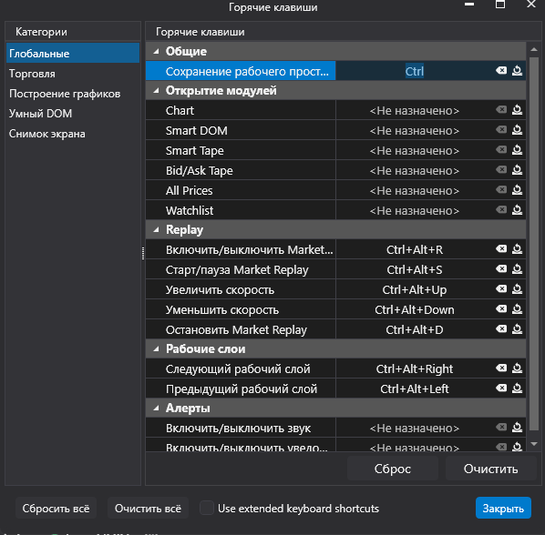 С помощью данной функции вы можете настроить горячие клавиши по вашему усмотрению: для торговли, управления графиком, стакана и глобальные настройки.