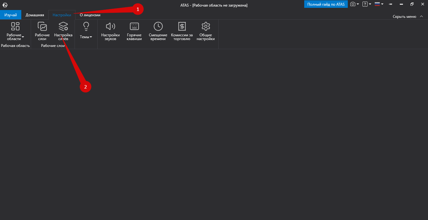 - В главном окне программы зайдите в меню Settings/Настройки, затем выберите Layouts/Рабочие слои.