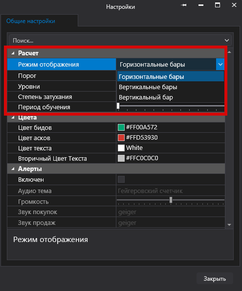 Режим отображения — тип визуализации (Горизонтальный / Вертикальный / Центральный).