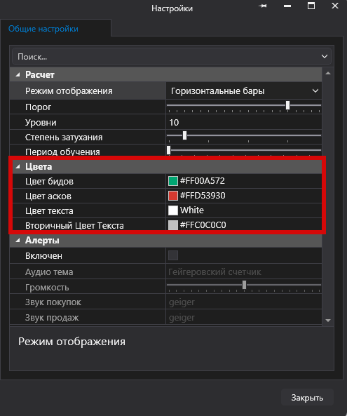Цветные полосы ликвидности (зеленые для Bid, красные для Ask).
